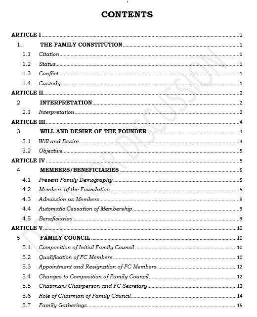 We organize one-on-one meetings of each family member in order understand the family better. After several rounds of one-on-one meetings, we then present our 1st draft for further deliberation. Upon approval, the Family Constitution will be drafted to be signed by the respective members of the family. Below is a sample of index pages and the content of clauses of a particular Family Constitution well over 60 pages.